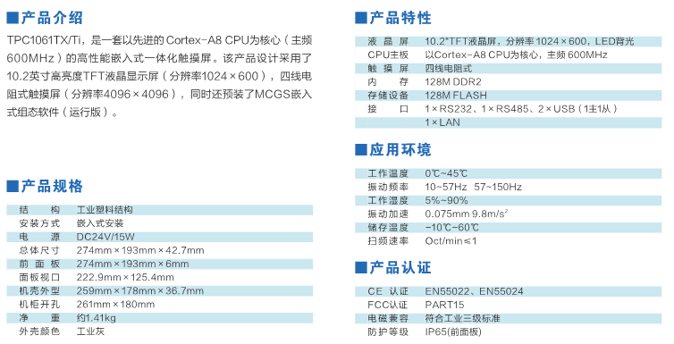 TPC1061Ti,是一套以先進的Cortex-A8 CPU為核心(主頻600MHz)的高性能嵌入式一體化觸摸屏。該產(chǎn)品設(shè)計采用了10.2英寸高亮度TFT液晶顯示屏(分辨率1024×600),四線電阻式觸摸屏(分辨率4096×4096)。同時還預(yù)裝了MCGS嵌入式組態(tài)軟件(運行版),具備強大的圖像顯示和數(shù)據(jù)處理功能。